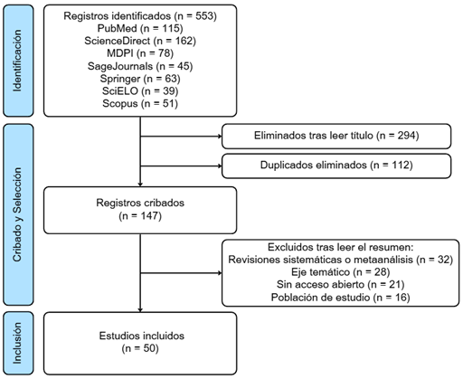 La fase de identificación inicial arrojó un total de 553 registros distribuidos en las bases de datos consultadas: PubMed (115), ScienceDirect (162), MDPI (78), Sage Journals (45), Springer (63), SciELO (39) y Scopus (51). Tras la depuración de los metadatos, se eliminaron 112 registros que se encontraban duplicados entre los repositorios, dejando un total de 441 artículos para la fase de tamizaje por título y resumen. En este primer cribado, se descartaron 294 documentos que no cumplían con el enfoque temático principal o que no abordaban directamente la seguridad deglutoria mediante el uso de espesantes (ver Figura 1).